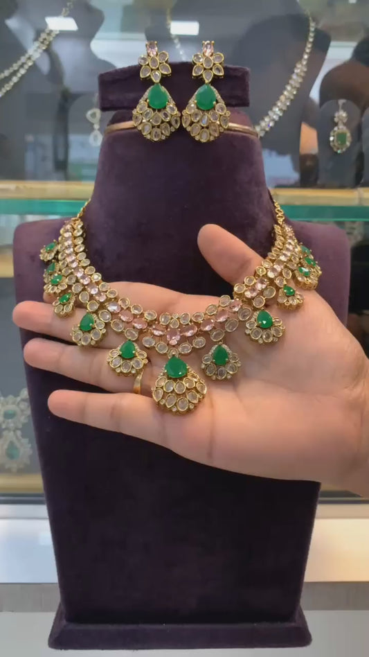 Elegant Kundan & Emerald Green Stone Necklace Set with Earrings